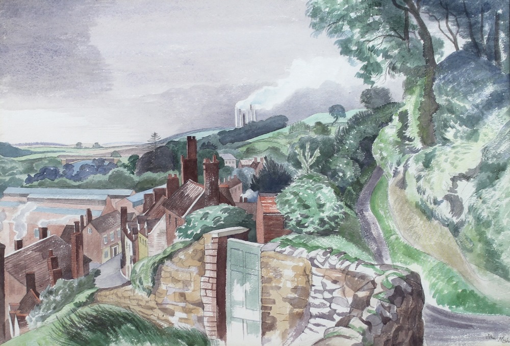 | A country village within a hilly landscape, with smoking industrial chimneys in the distance | |