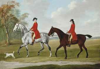 | John and Andrew Corbet on two hunters, with a terrier, in an extensive landscape | |