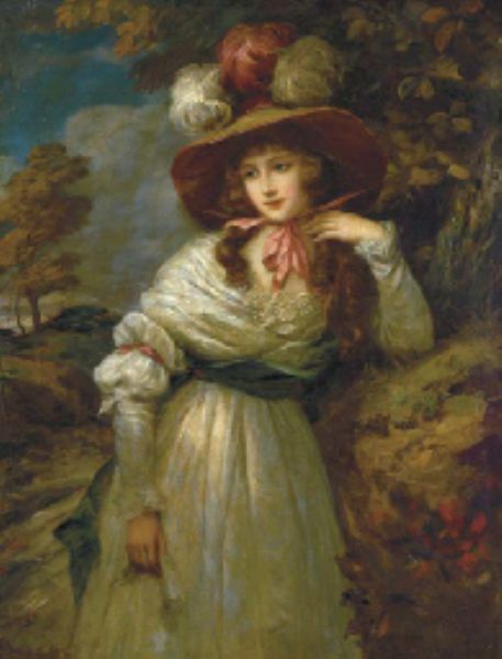 | Portrait of a lady, said to be Miss Melville, three-quarter-length, standing in a white dress and plumed hat, in a landscape | |