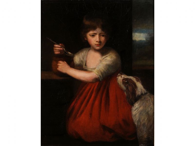 | An interior scene with a young boy with a silver spoon drinking from a bowl | |