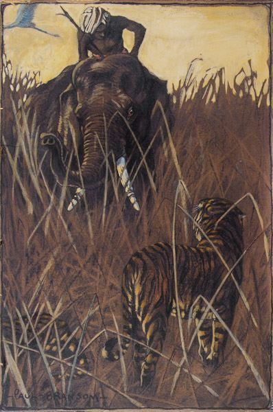 | Man in turban atop elephant, looking down to tigers in tall grass. | |