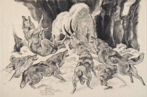 Mountain goat fending off wolves