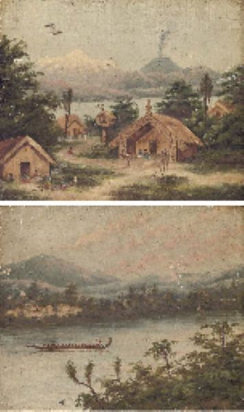 | Figures within a Maori Pa beside a lake, with mountains beyond; and A Maori war canoe on a lake, with a Maori settlement beyond | |