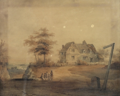 a cottage, with travellers resting on the roadside in front near a signpost,