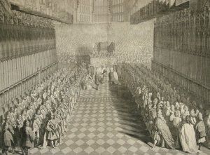 Prince William offering his Sword to the Dean, at the Altar, the Knights, Standing under their Banners