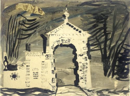 | Pen and black ink, watercolour, gouache, wax resist and paper collage | |