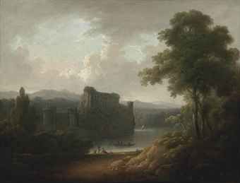 | A wooded landscape with a ruined moated castle, figures ferrying across the water and others resting on the bank | |