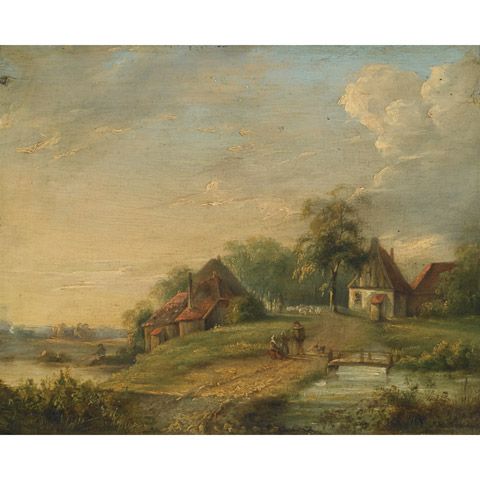 FAMILY AND THEIR DOG IN A RIVERSIDE TOWN