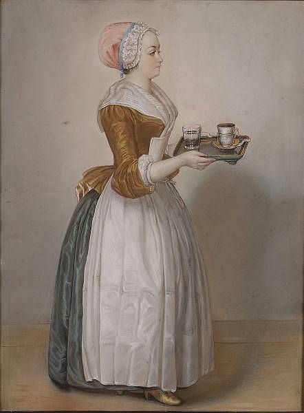Full length portrait of a maid, carrying a tray of drinks