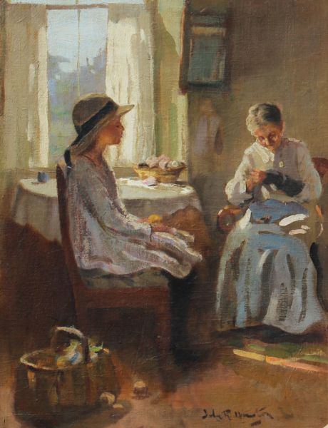 | ''A Visit to Grandma'', Interior Genre Scene With Young Girl Watching Her Grandmother Knit by a Sunlit Window | |