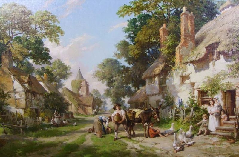 Village Scene in Summer, with Figures, a Donkey and Geese