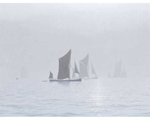 Thames barges gliding through the early morning mist