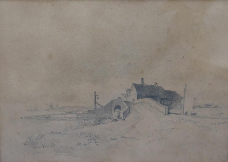| A landscape with a bridge, cottages and a sailing boat, the coast visible beyond | |