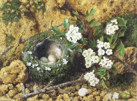 A BIRD'S NEST AND BLOSSOM ON A MOSSY BANK