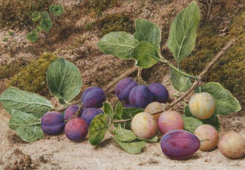 Still life of plums on a mossy bank