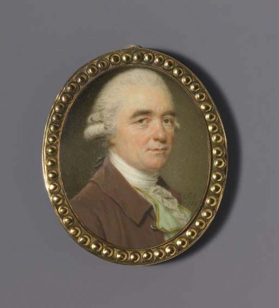 | A gentleman, in aubergine brown coat and gold-piped mint-green waistcoat with lace cravat, powdered hair en queue | |