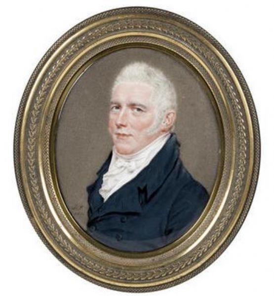 wearing dark blue coat, white waistcoat, frilled chemise and tied stoc