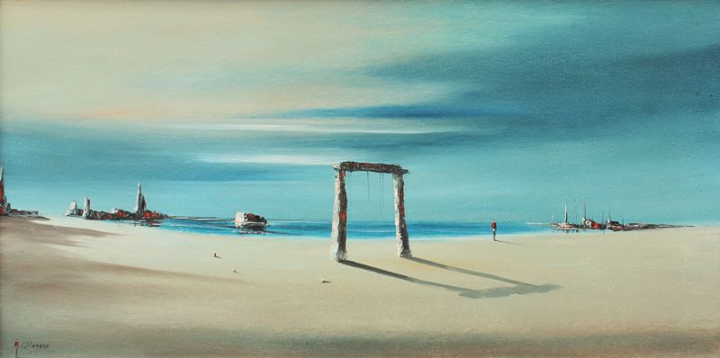 Surreal Shoreline with Ruin Boats and Figure