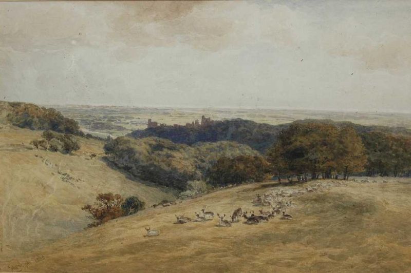 | A castle in an extensive wooded landscape with the sea beyond, thought to be Arundel | |