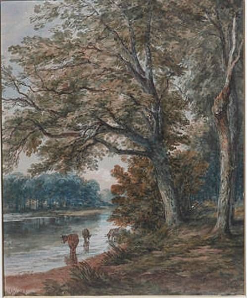 woodland river scene with cattle watering in the foreground