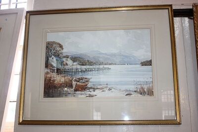 | View across a Cumbrian lake, jetty and moored boat foreground, mountains beyond, 'The Jetty - Pooley Bridge' | |