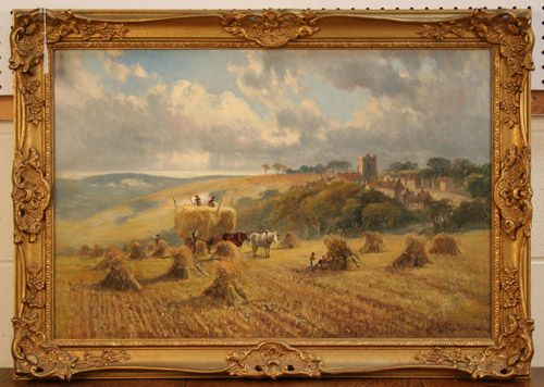 | Hilly Landscape with Figures loading Hay onto a Cart, a Village and Church beyond | |