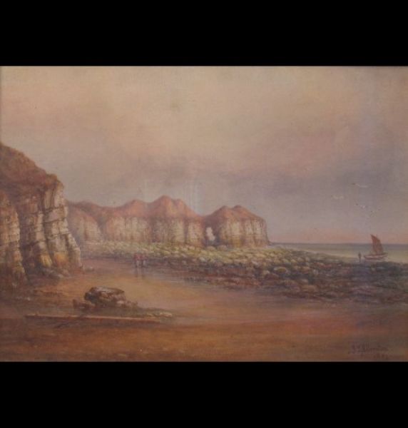 East Yorkshire coastal scene with figures on the beach and a boat landing