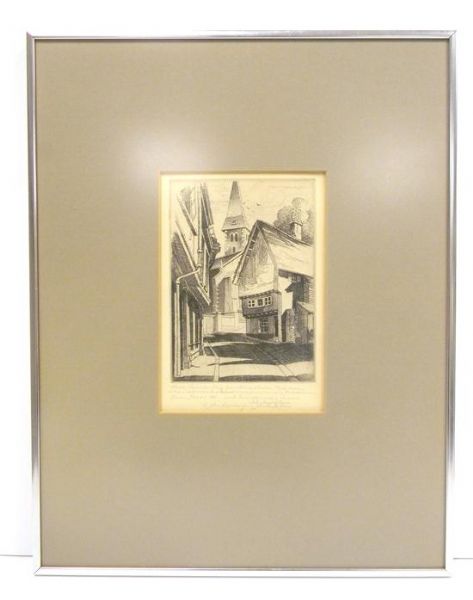 | Drawing etched, and printed by artist, showing medieval street with Gothic church spire | |