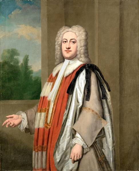| Portrait of an earl, three-quarter length, in peer's robes, standing in an interior with a view to a landscape beyond | |