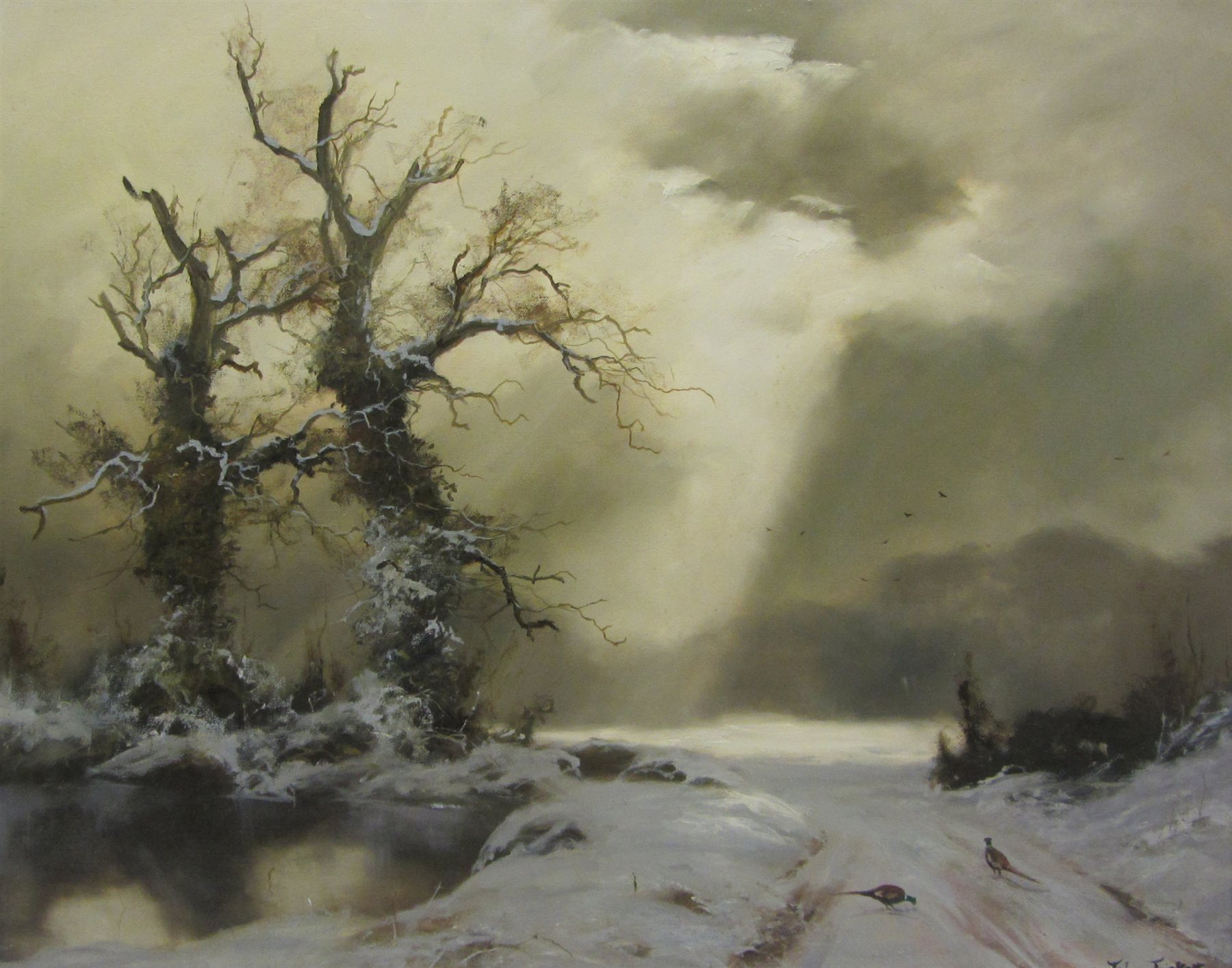 Winter Landscape with Pheasants near a Pond
