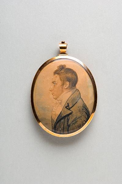 A Gentleman in profile to the left, wearing black coat over white waistcoat and tied stock.
