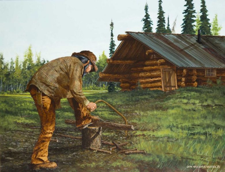 Starting Supper, of an Alaskan hunter by his cabin sawing kindling