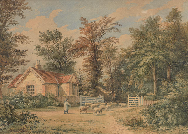 A boy driving sheep past a gatehouse, Polesdon Lacey