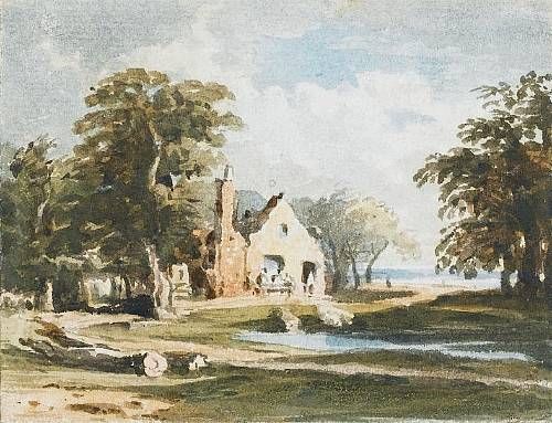 A landscape with an inn in the distance