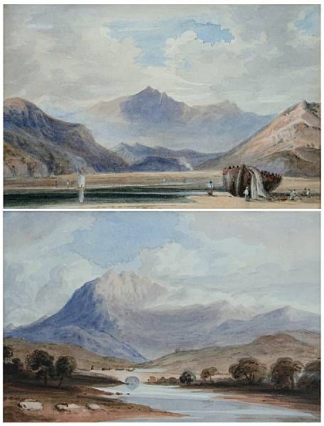 Estuary scene with mountains, possibly North Wales, and another, a mountain landscape