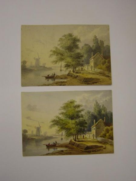 FIGURES BY A COTTAGE NEAR A COUNTRY POOL