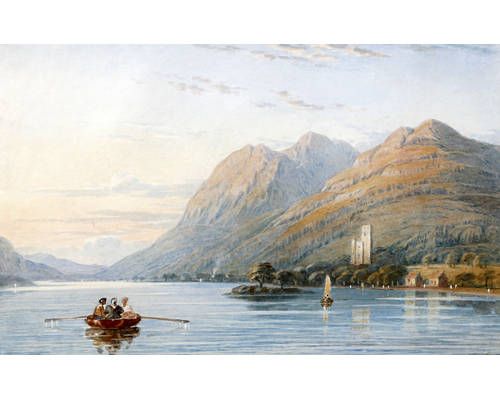 Mountain lake scene with figures in a rowing boat