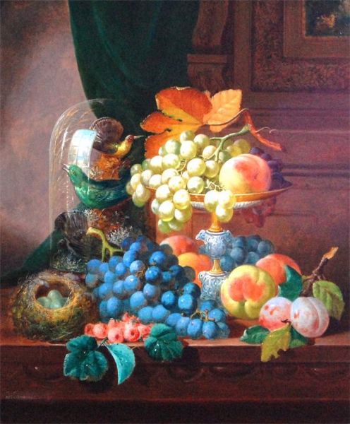 | Still life with fruit, stuffed birds and birds nest on a ledge | |