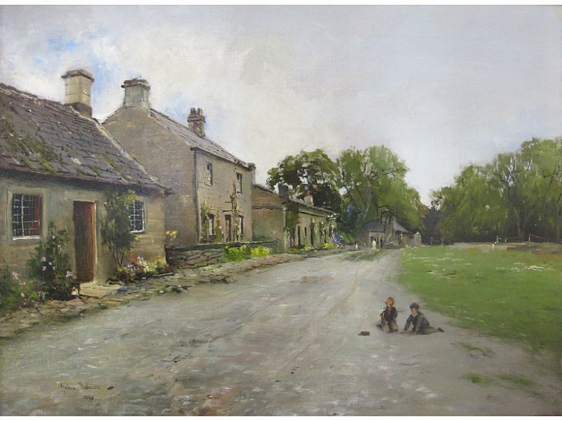 CHILDREN PLAYING BEFORE COUNTRY COTTAGES