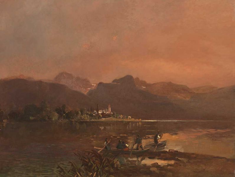 Alpenlandschaft mit Kähnen auf Gebirgssee.