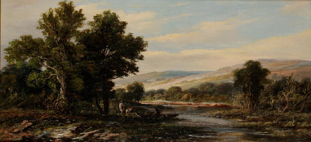 | A rural river scene with figures on the bank whilst another is seated in a boat | |