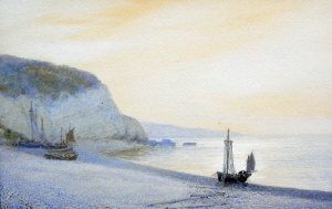 Beached fishing vessels on a tranquil shore