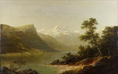ROCKY MOUNTAIN SCENE WITH RIVER AND SHORE
