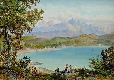 Hirten mit Ziegen auf einer Anhöhe vor alpinem See