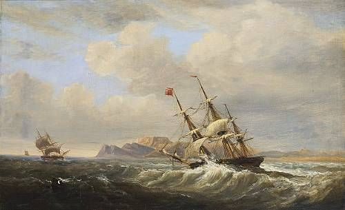| A three-masted merchantman in a heavy swell off Camps Bay as she prepares to round Cape Point heading for Table Bay and Capetown | |