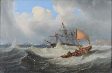 | A three masted merchantman lying to wind, under anchor, in a gale off a lee shore, a fishing smack running before the storm in t | |