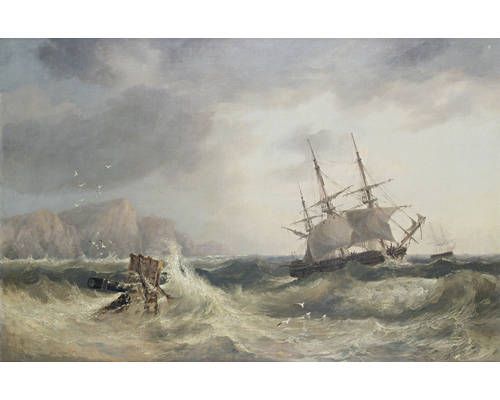 A three-masted merchantman reefed down in heavy seas off a rocky shore
