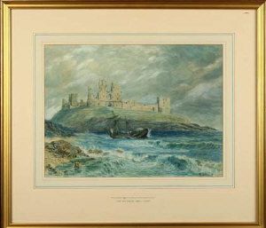 A sailing ship run aground near Dunstanburgh Castle, Northumberland