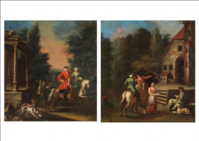 | Figures on Horseback beside Classical Ruins, setting out to go hunting; Figures on Horseback taking Refreshment, other figures a | |