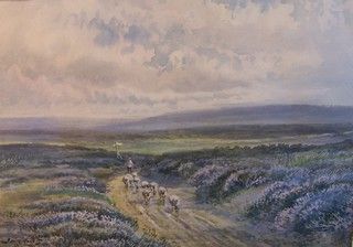 moorland landscape with shepherd and sheep on a country path